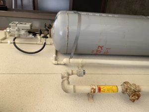 ボンベ左側の配管は元々都市ガスを送っていた配管で、ここにプロパンガスをつないでコンロや給湯器にプロパンガスを送ります。